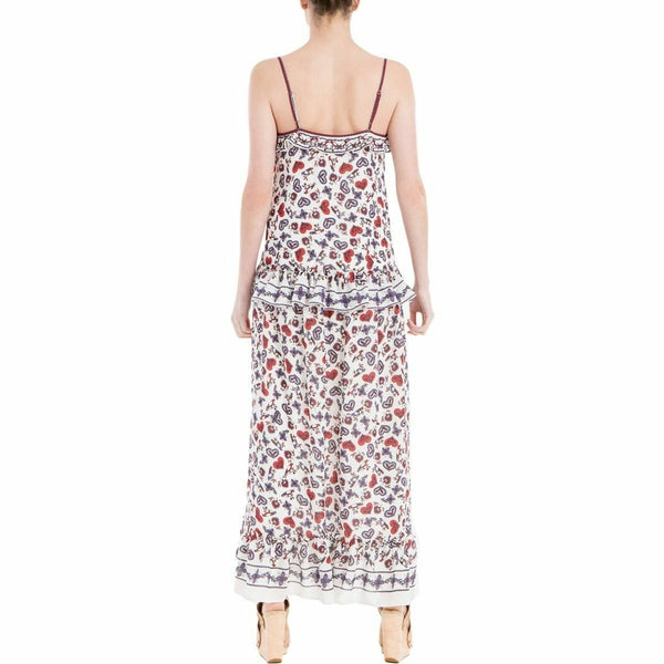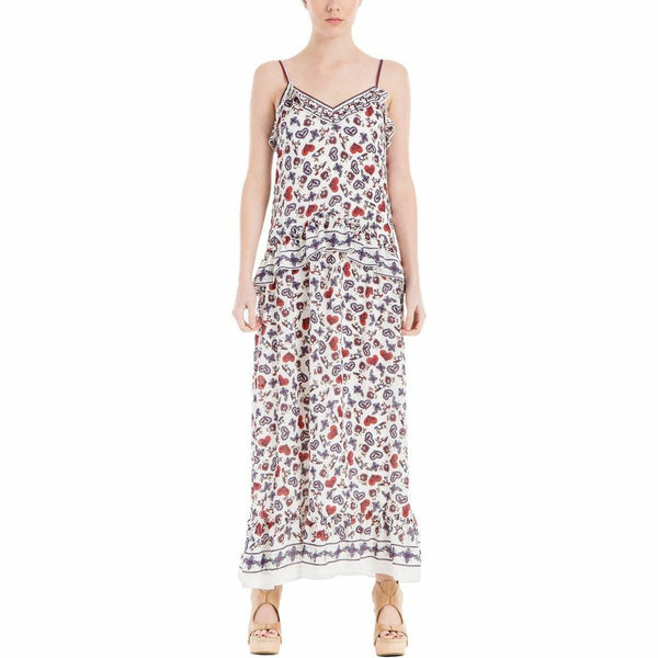 Details & Care Ruffle trim adds a playful vibe to this printed maxi dress from Max Studio London. Pullover styling Hits at foot V-neckline; Shift silhouette Adjustable spaghetti straps Allover print; ruffles at neckline and waist Generous sizing; if in-between...